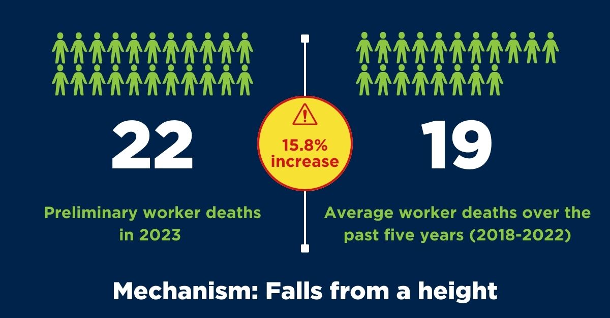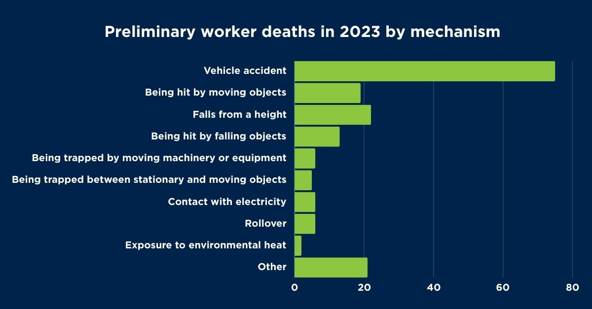 The below chart outlines the worker deaths by mechanism for preliminary worker deaths in 2023.